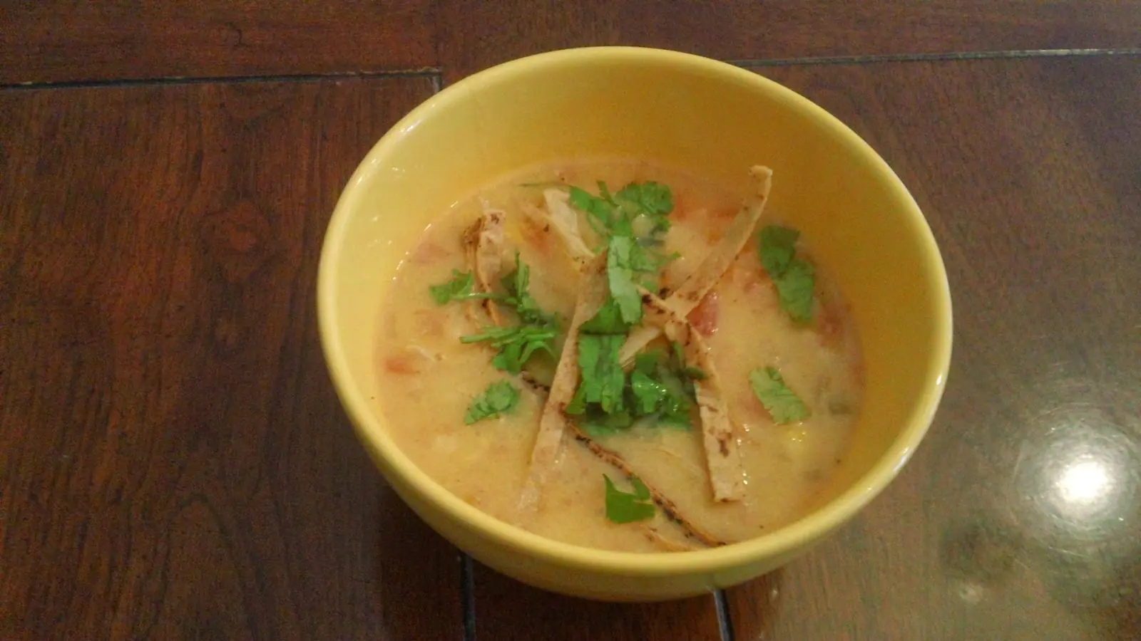 Crema de elote vegetariana con tiritas de tortilla